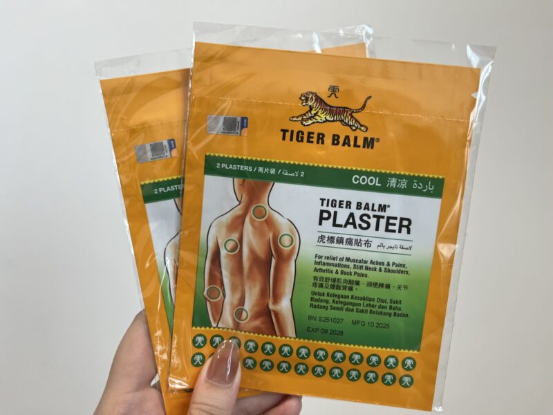 これは日本では見かけないタイガーバームの冷湿布。見た目がタイガーバームブランドってだけで、「え、タイガーバームの湿布なんてあるの?!」といつもすごく驚き喜んでもらえます。