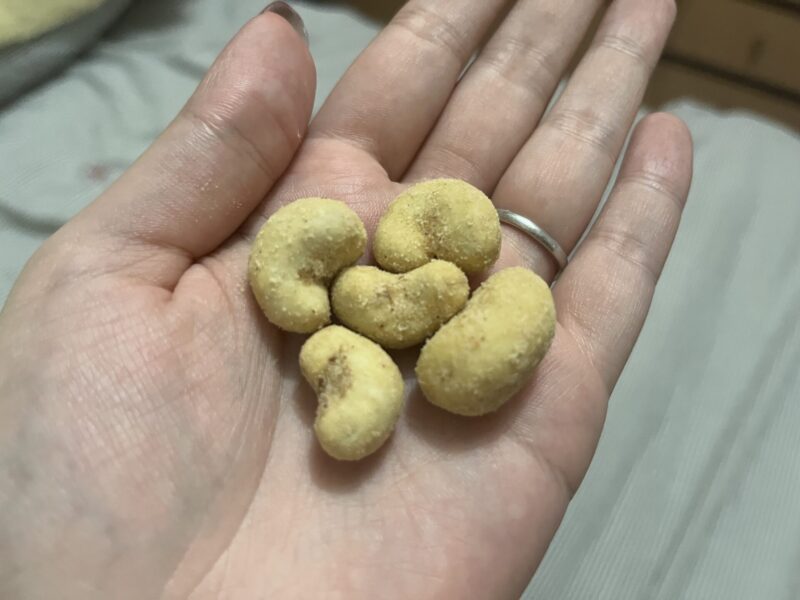 カシューナッツがカリッカリのスナックの衣?に包まれていて、ガーリックパウダーがこれでもかとまぶされている商品。
